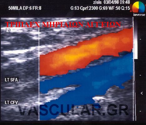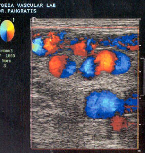 Ãéá ôïí Ýëåã÷ï ôùí ëáãïíßùí áñôçñéþí ÷ñçóéìïðïéïýìå ôçí ßäéá ôå÷íéêÞ B-mode real-time êáèþò åðßóçò êáé ãéá ôïí Ýëåã÷ï ôùí ìçñéáßùí áñôçñéþí. ×ñçóéìïðïéïýìå ç÷ïâïëÝá 3,5 êáé 7,5ÌÇÆ áíôßóôïé÷á.